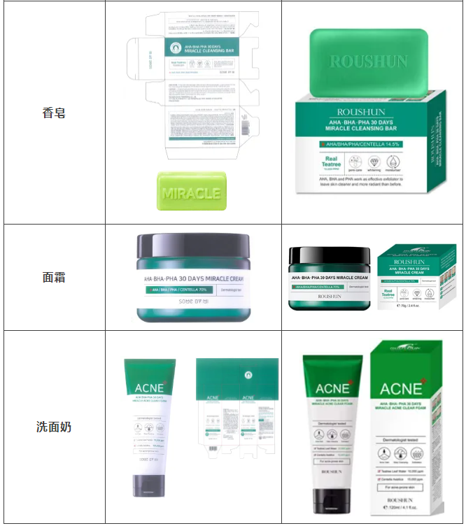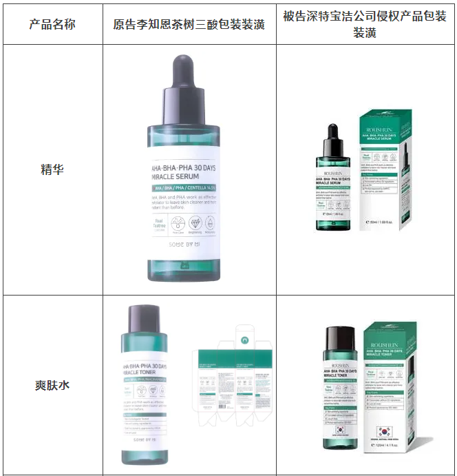 2021年原告委托球探体育比分网调查发现,被告汕头市深特宝洁实业有限公司生产、销售和推广的“茶树祛痘美白补水液”“茶树香皂”等护肤品,其产品包装装潢直接抄袭、摹仿原告前述已经具有较高知名度和影响力的“SOME BY MI/莎柏蜜”茶树三酸系列化妆品和黑蜗牛精华液的包装、装潢设计,使用与之近似的标识,造成消费者混淆误认。故原告作为茶树三酸、黑蜗牛精华包装装潢权益获益人,诉至广东省汕头市中级人民法院。汕头中院认定:李知恩主张的茶树三酸、黑蜗牛精华包装装潢构成具有一定影响的包装装潢,深特宝洁公司生产、销售茶树三酸、黑蜗牛精华液的行为构成不正当竞争。因判赔额不符合原告预期,原告后上诉至广东省高级人民法院,广东省高级人民法院最终维持一审判决。