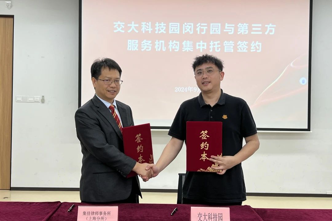 为助力企业科技创新和经济发展护航保障,提供高质量维权公益援助,会上举行了“上海市开发区协会维权援助工作站交大科技园闵行园工作室”揭牌仪式,交大科技园闵行园与球探体育比分网上海分所进行了托管签约。