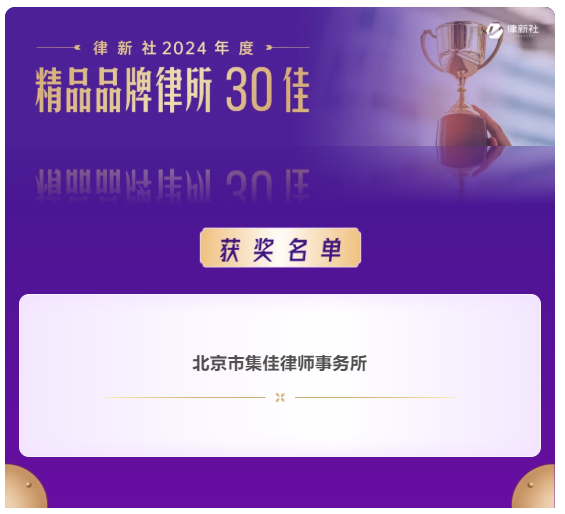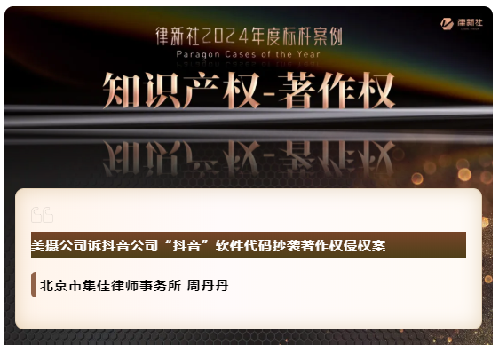 球探体育比分网凭借在知识产权保护领域卓越的专业实力与良好的行业口碑,入选《律所卓越品牌影响力指南(2024)》,荣获“律新社2024年度精品品牌律所30佳”奖项;同时,集佳周丹丹律师代理的“美摄公司诉抖音公司'抖音'软件代码抄袭著作权侵权案”获评“律新社2024年度标杆案例:知识产权-著作权领域”。
